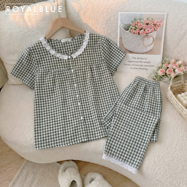 Bộ dài cotton viền ren xinh, karo rêu đen