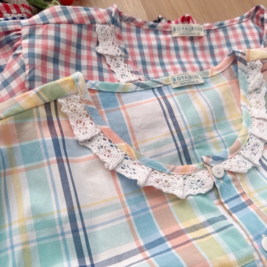 Bộ dài cotton viền ren xinh, karo xanh cam