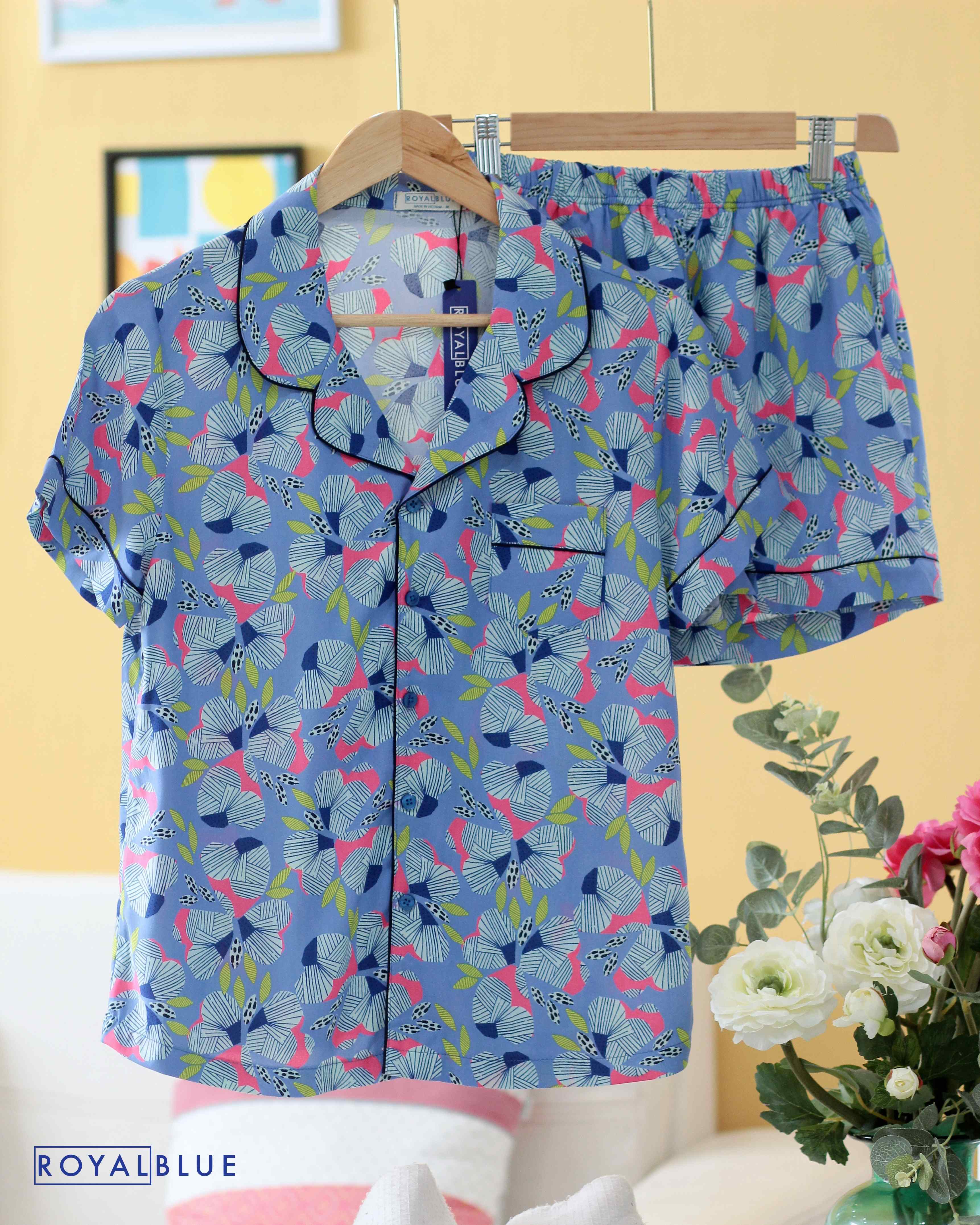 Đồ bộ đùi pijama xanh bông kẻ.